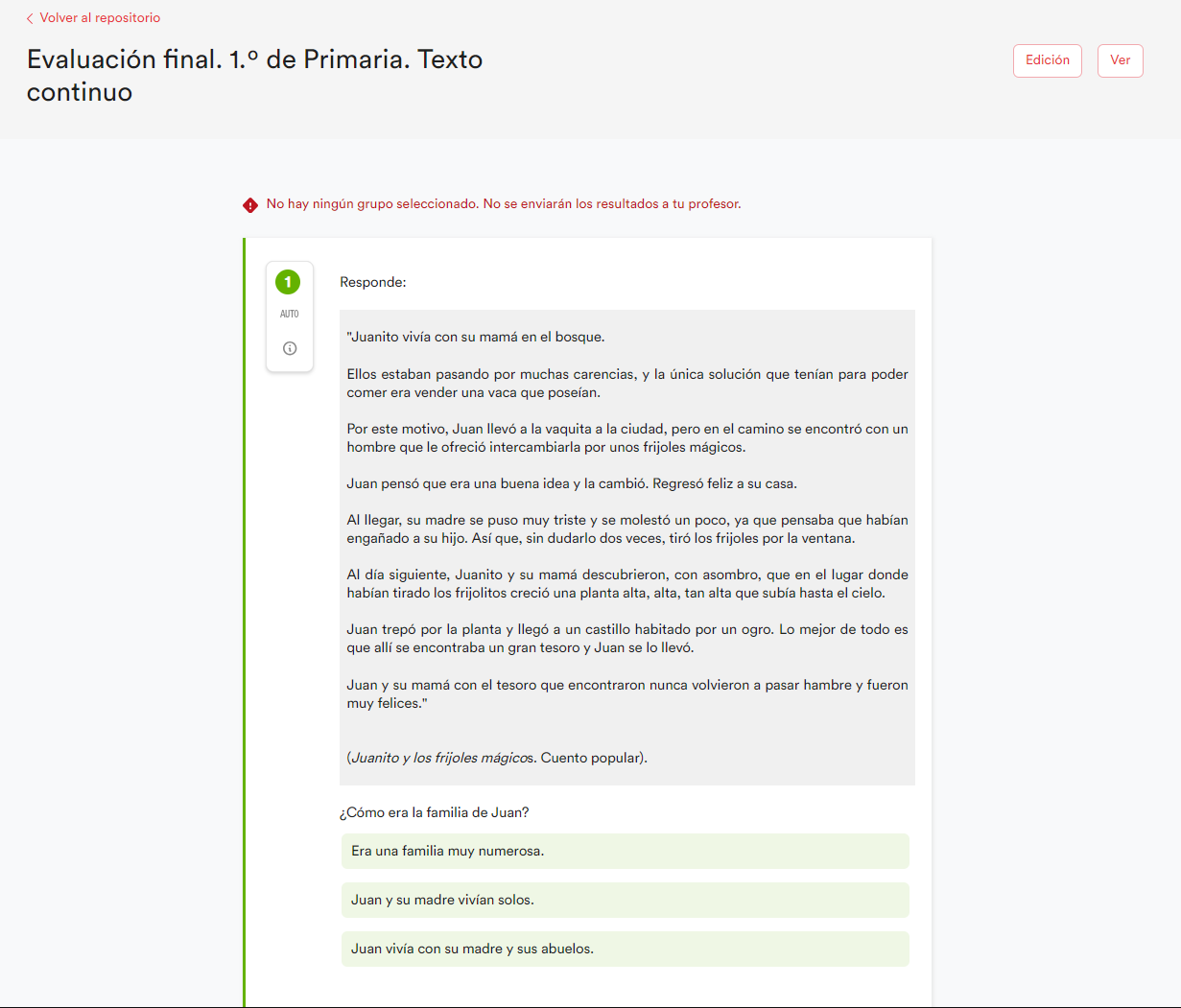 Si haces clic en alguna prueba, accederás a un texto de referencia y a una serie de actividades relacionadas con este.