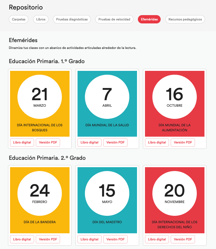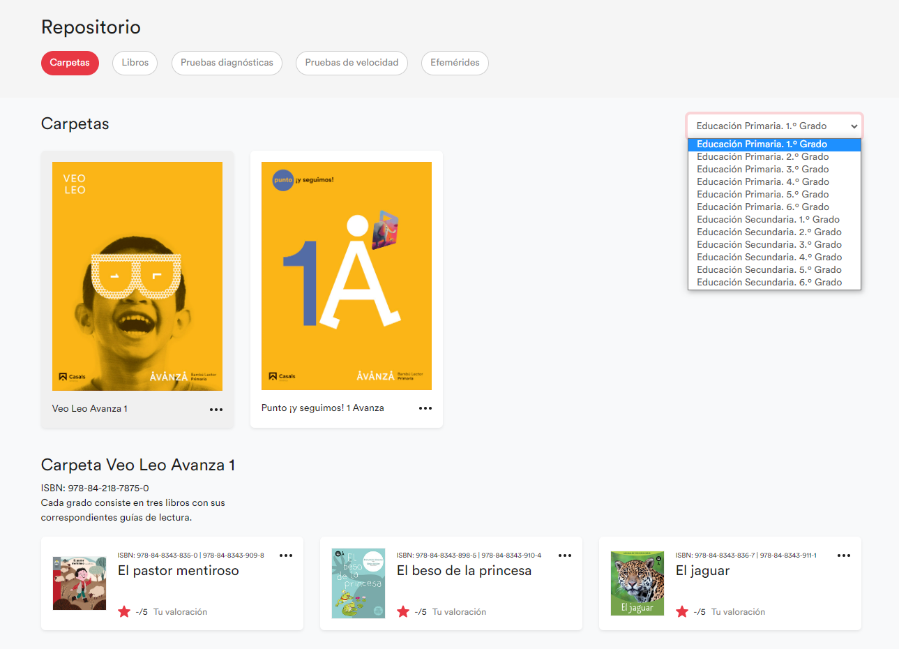 Esta sección permite acceder a la versión digital de las dos colecciones de carpetas (VeoLeo Avanza y Punto… ¡y seguimos!) de Bambú Lector Avanza. Cada colección consta de seis carpetas, una para cada grado de Primaria, con una selección de tres libros.
