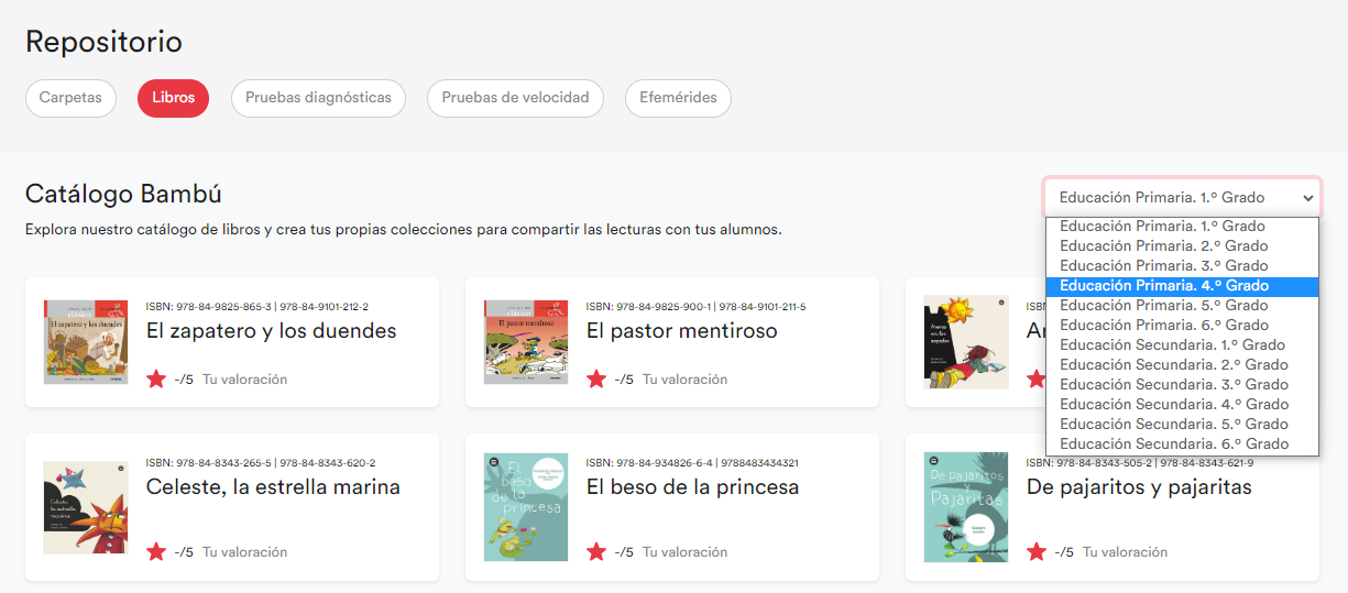 Sección que incluye los libros de fondo de Bambú agrupados por grados.