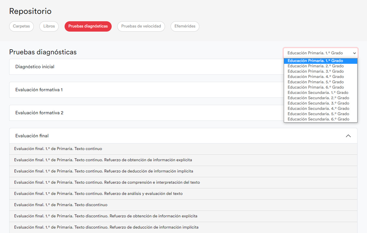Filtra por grado educativo y accede a todas las pruebas disponibles.