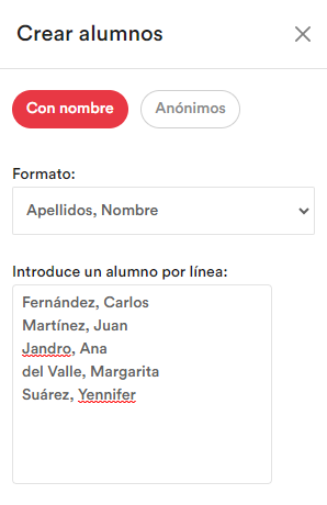 - - Si seleccionas Con nombre, puedes escribir o pegar los nombres y apellidos de tus alumnos. De esta forma cuando se creen los usuarios ya tendrán asignado este campo.