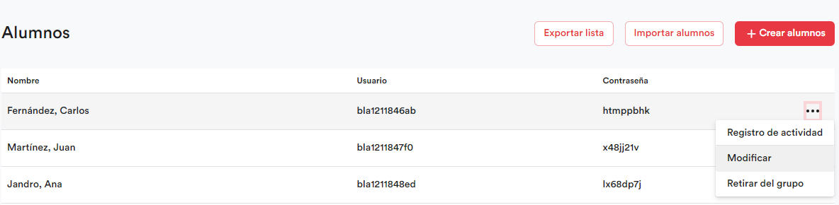 - Haz clic en + Crear alumnos.