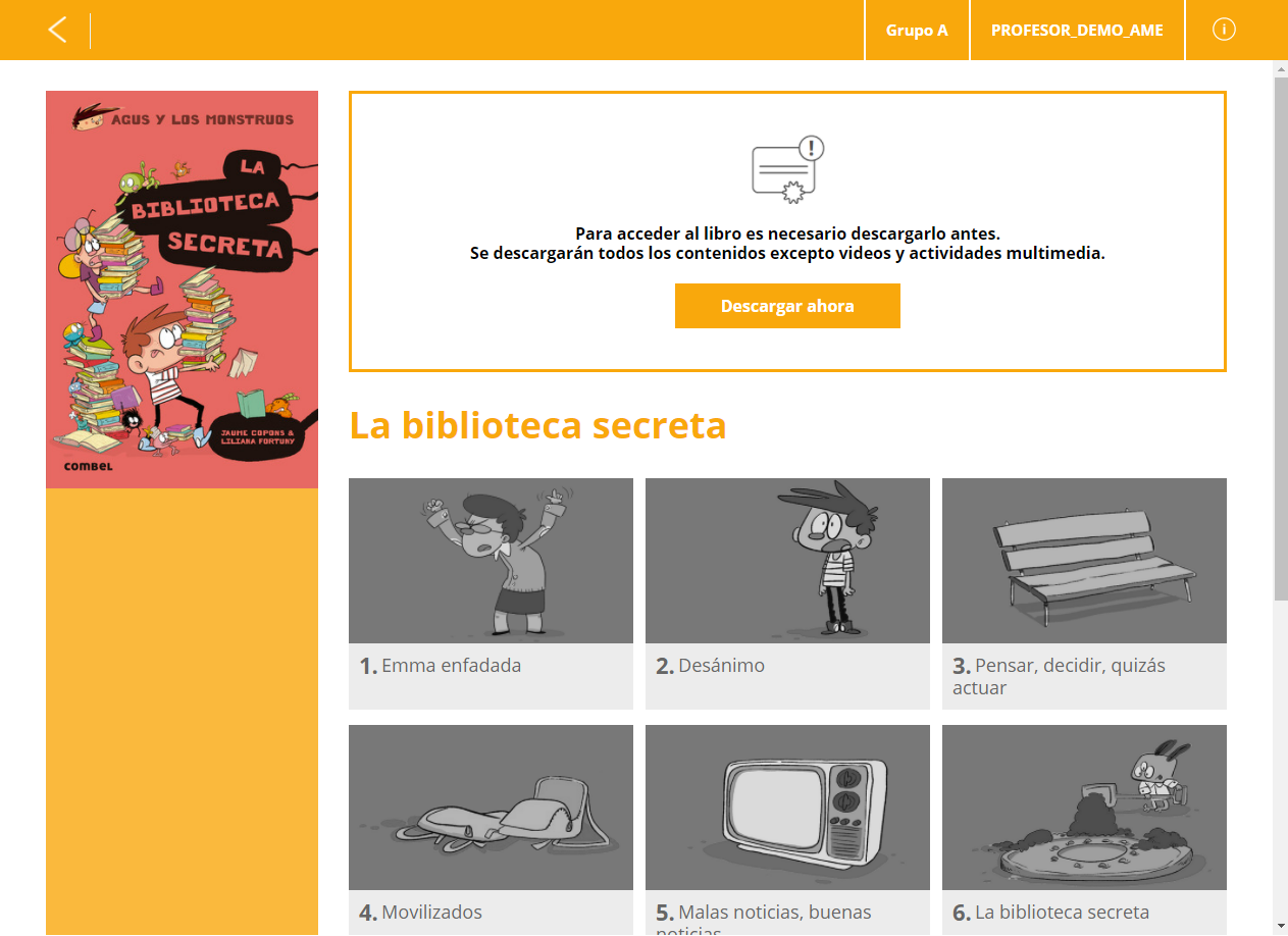- Haz clic en la portada de la lectura para acceder a todos los capítulos. La primera vez que se accede a una lectura es necesario descargarla para su consulta offline. Para ello, haz clic en Descargar ahora.