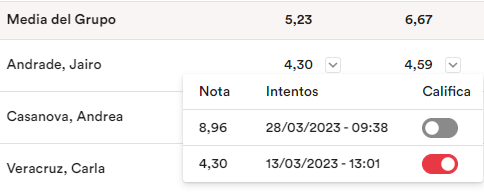 - Consulta la información sobre los intentos realizados por tus alumnos haciendo clic en el botón situado a la derecha de la calificación, que activa el desplegable. Indica los resultados que se tendrán en cuenta para realizar el cálculo de la calificación final haciendo clic en el botón correspondiente.