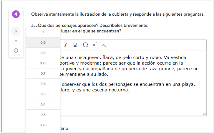 - Haciendo clic encima del resultado se accede a la vista en detalle de las respuestas del alumno. Puedes calificar las actividades de respuesta abierta mediante el menú desplegable. La calificación final queda guardada de forma automática.